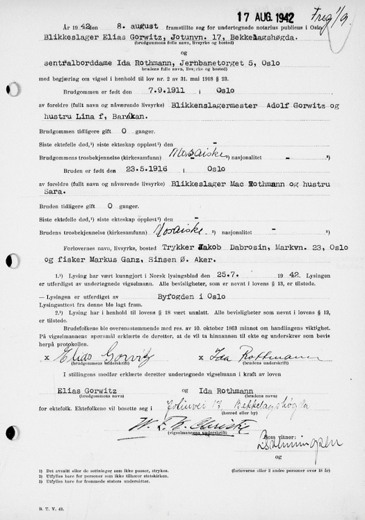 Six months later, Norway was occupied by the Nazis. 773 Jews were deported from Norway, only 35 men survived. When Ida Rottmann completed the Nazi collaboration regime’s “Questionnaire for Jews in Norway” in 1942, she gave her occupation as “secretary”. For her profession, however, she entered “actress”. In August of the same year, she married Elias Gorvitz, a Norwegian Jew. Three months later they were both deported on the ship SS Donau. Ida Gorvitz was murdered in the gas chamber on her arrival at Auschwitz-Birkenau, aged 26 and in her sixth month of pregnancy.