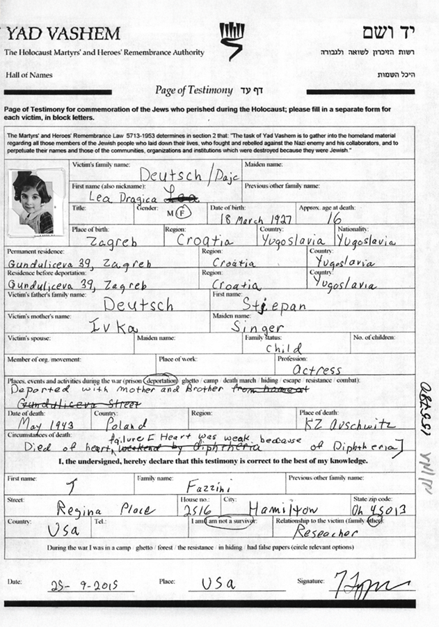In 1941, the Independent State of Croatia was established on the territory of present-day Croatia and Bosnia and Herzegovina, where racial purity laws, modeled on those of the Nazis, were introduced as recently as April of the same year. Mass arrests of Jews began in June 1941.To save themselves, the Deutsch family converted to Catholicism. Despite various attempts to seek help, in May 1943 Lea, her mother and brother were arrested and deported to Auschwitz. Lea died on the way to the camp or shortly after reaching it. Her mother and brother died in Auschwitz. Her father survived the Holocaust by hiding in a ward of the Sisters of Mercy Hospital in Zagreb. He was convinced that he was the only one in real danger as an adult. He died in 1959.